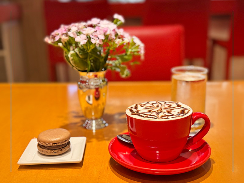 Café, leche, espuma, syrup de chocolate, cacao