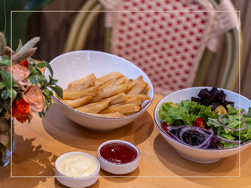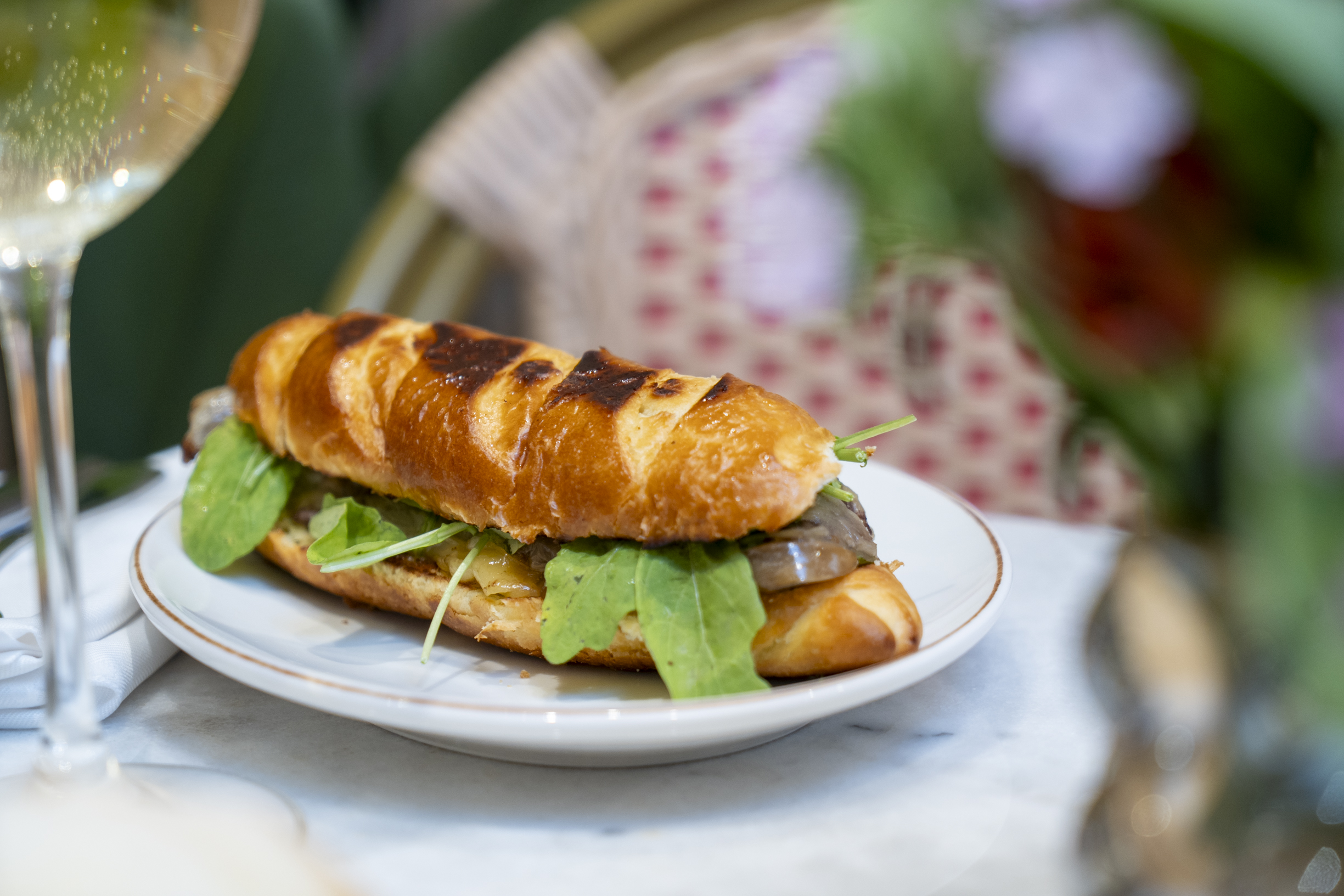 Mayonesa de chimichurri, cebolla caramelizada, queso ahumado y rúcula fresca
