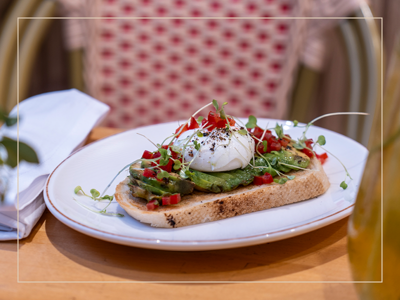 Pan de masa madre, palta y huevo a 63°, tomate concasse, cilantro y garrapiñada de maí y togarashi